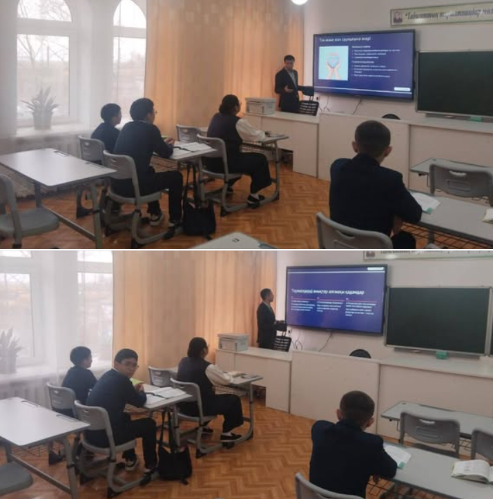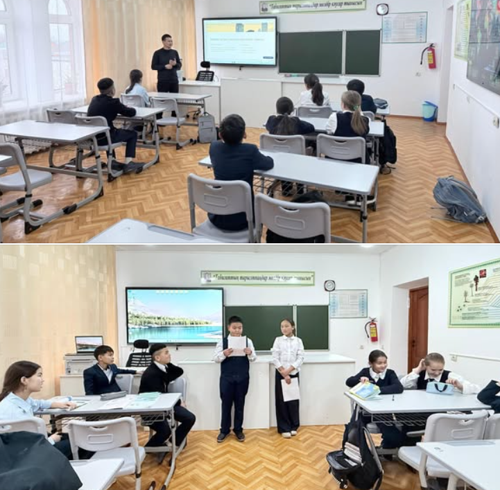 «Заң және менің құқығым» атты бірыңғай интерактивті сабақ өтті Өндіріс ауылының жалпы орта білім беретін мектепте «Заң және менің құқығым» тақырыбында 6-сынып оқушыларымен бірыңғай интерактивті сабақ өтті. Іс-шараның мақсаты – оқушылардың құқықтық мәдениетін арттыру, заң талаптарын сақтау мен өз құқықтары мен міндеттерін білуге баулу болды. Сабақ интерактивті форматта өтіп, қатысушылар белсенді пікір алмасып, өз ойларын ортаға салды. Жетекшісі: Жапаров А.Қ. #заңжәнетәртіп