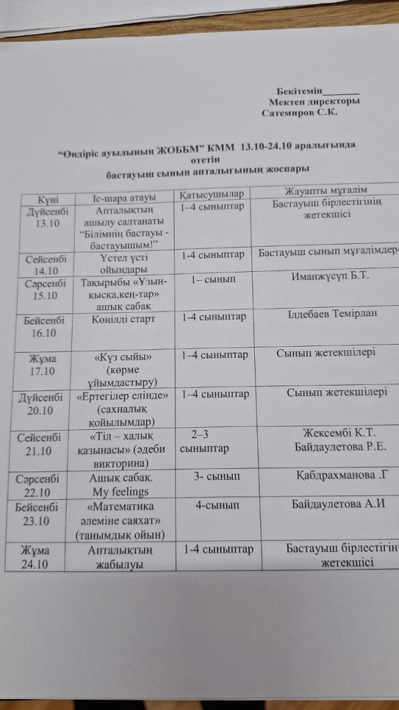 "Өндіріс ауылының ЖОББМ" КММ 13-24 қазан аралығында өтетін бастауыш сынып апталығының ашылуы.13 қазан күні бастауыш сынып апталығы ашылу салтанаты өткізілді. Бастауыш бірлестігі жетекшісі: Байдаулетова А.И.