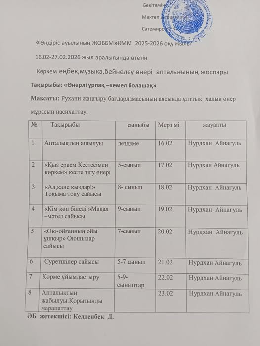 Шығармашылық апталықтың ашылуы. Тақырыбы:"Өнерлі ұрпақ-кемел болашақ". Мақсаты: Рухани жаңғыру бағдарламасының аясында ұлттық халық өнер мұрасын насихаттау.